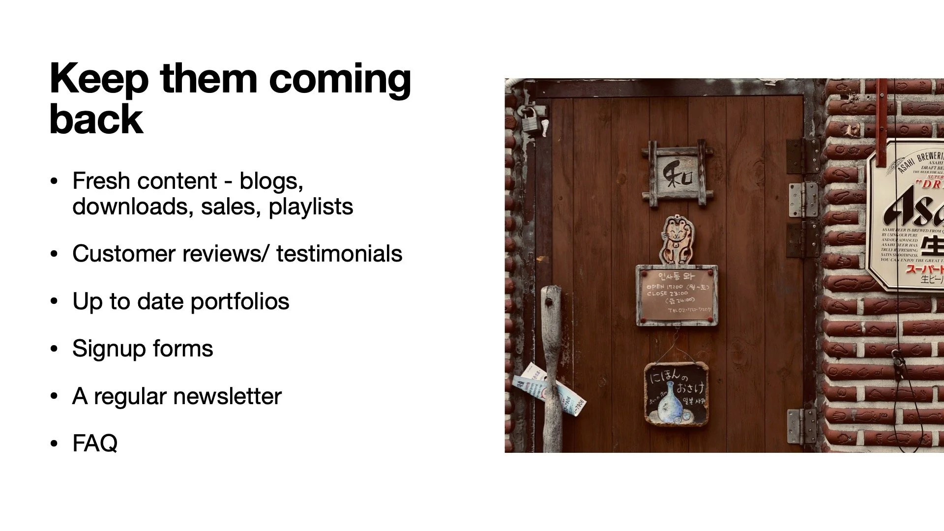 Websites are crucial for building a database and cultivating an audience off social media. Getting people to return to your website is vital for building trust and rapport, ultimately leading to conversions. There are multiple ways that you can keep your website fresh, utilising features like email sequences and automated reminders to encourage repeat visits and eventually sales to happy customers.