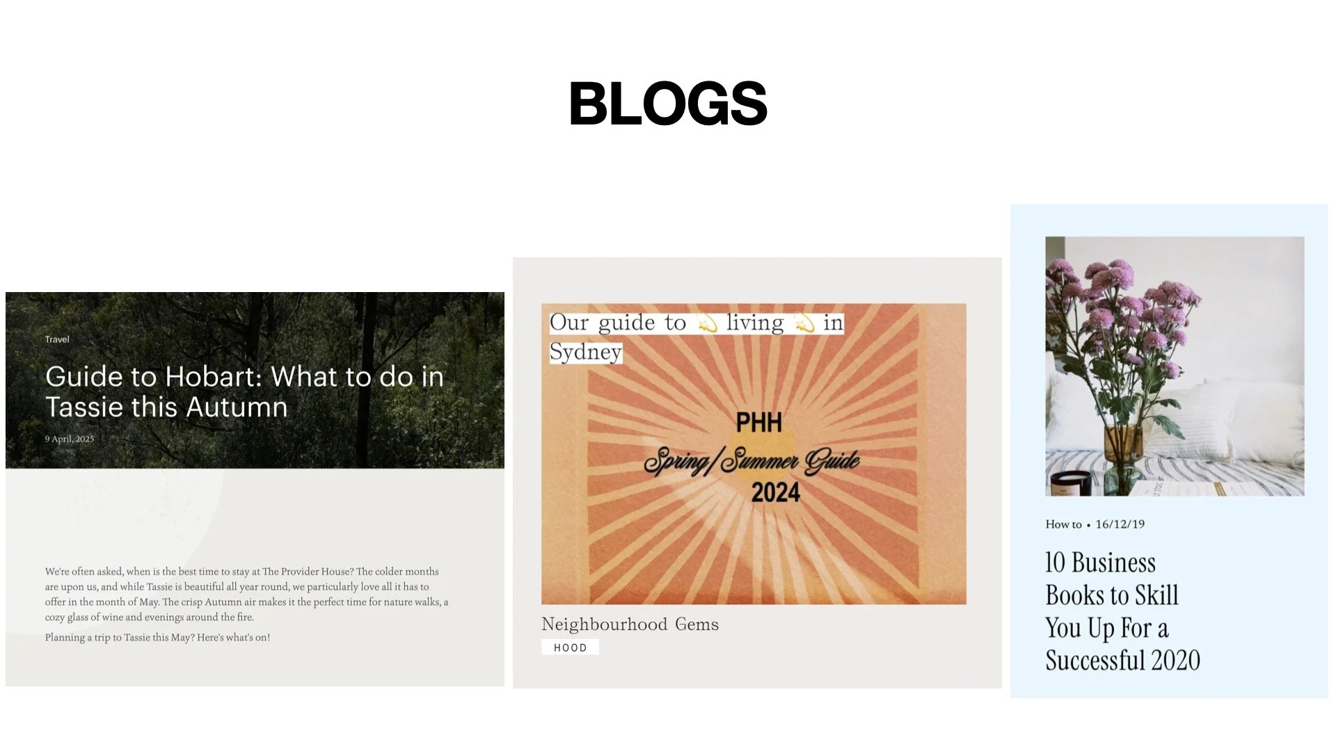 Examples of different types of blog (left to right) Provider Store, Paramount House Hotel, StartUp Creative